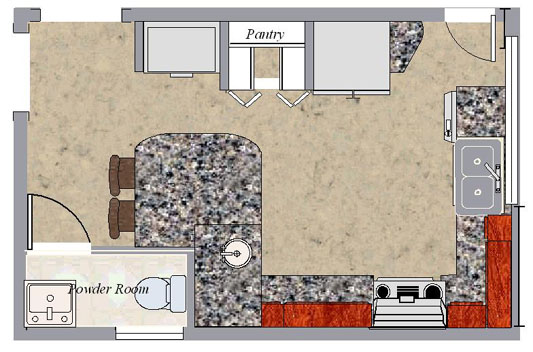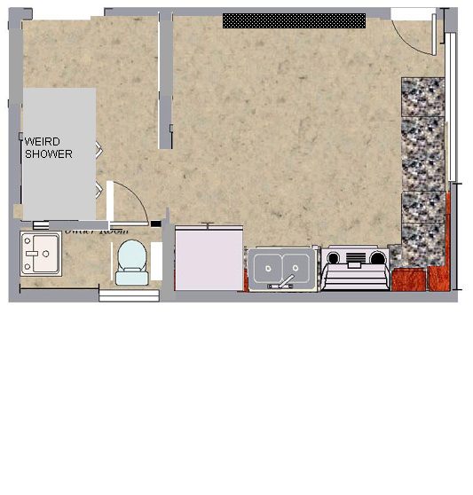 | Okay-- OUR kingdom. (I have to get used to saying that!) One of the biggest questions we are going to have is -- what are we going to do with our kitchen? For those of you who have been there, you've seen it-- we definitely need to redo the kitchen. (For those of you who don't know, there's a wall in the middle of it, ugly kitchen floor, a very awkward bathroom, with a self-installed shower in an awkward place,even uglier kitchen cabinets, and a stove that doesn't work.) Changes HAVE to be made. We know which walls we need to knock down, and assuming we can (which we are pretty sure of) the question becomes-- how are we going to get everything that we need in there in there? We're waiting to hear from the kitchen guy with his design, but in the meantime, Stephanie found a room design program and has been playing with it. Here are the results so far-- We'd love to get your input!
